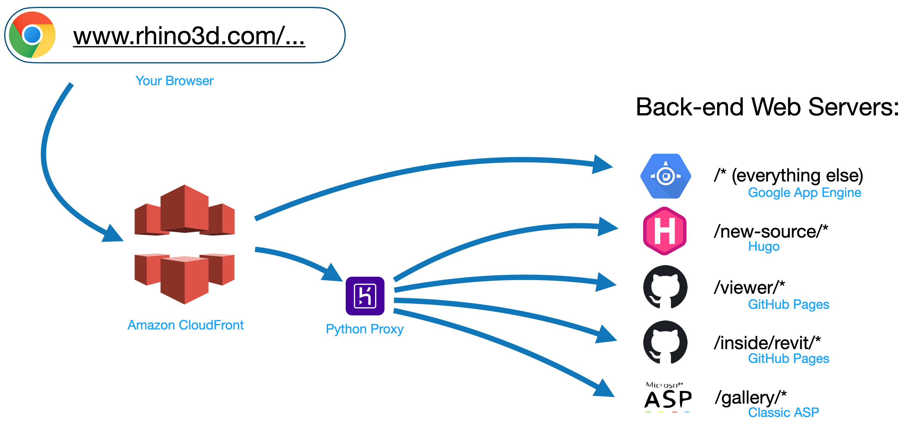 Starting in 2020, sections of www.rhino3d.com started to be hosted on back-end infrastructure besides Google App Engine. In order to make this work, Brian Gillespie wrote a HTTP reverse proxy in python that rewrites content from all the back-end servers to have links, images, and URLs that are on the www.rhino3d.com top-level domain. This proxy is responsible for: