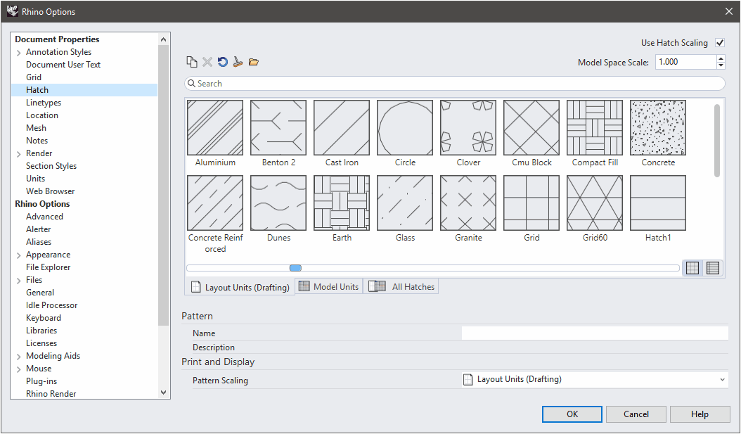 Rhino 9 includes new and complex patterns such as: Concrete, Rattan, Rubble, Stone. No need to struggle finding commonly used *.pat files to import!