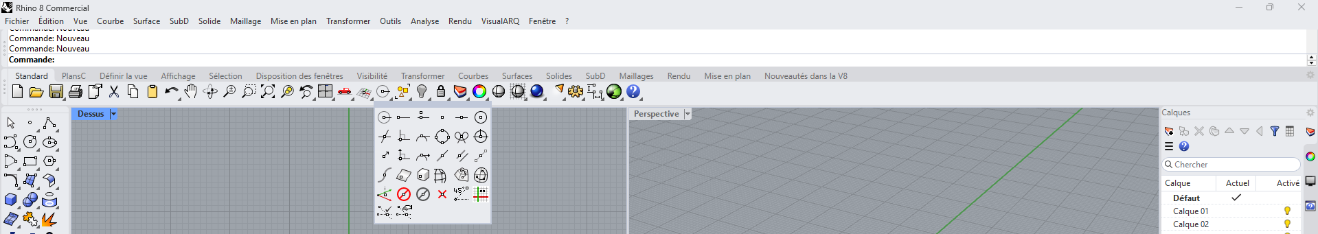 Quand Rhino vous demande de choisir un point (par exemple, le début d’une ligne), vous pouvez utiliser les accrochages aux objets pour choisir une position précise sur un objet existant. Lorsque vous déplacez le curseur à proximité de ce point, le marqueur est attiré dessus.