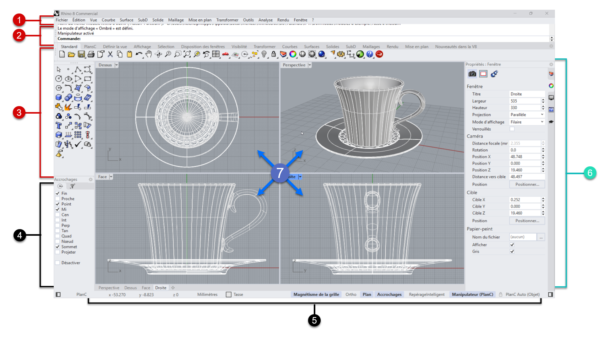 7 Les fenêtres sont des vues sur votre modèle. Elles vous permettent de visualiser et de naviguer autour de la géométrie que vous créez dans l’espace 3D. Par défaut, à l’ouverture Rhino affiche quatre fenêtres de visualisation :