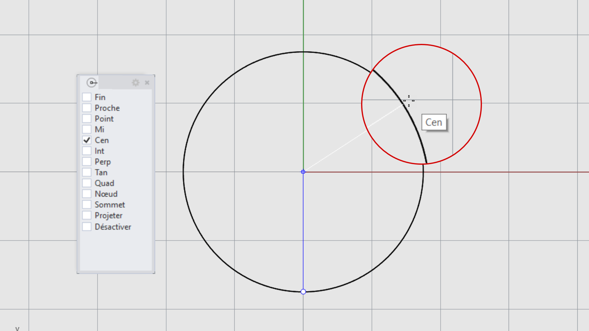 Quand Rhino vous demande de choisir un point (par exemple, le début d’une ligne), vous pouvez utiliser les accrochages aux objets pour choisir une position précise sur un objet existant. Lorsque vous déplacez le curseur à proximité de ce point, le marqueur est attiré dessus.
