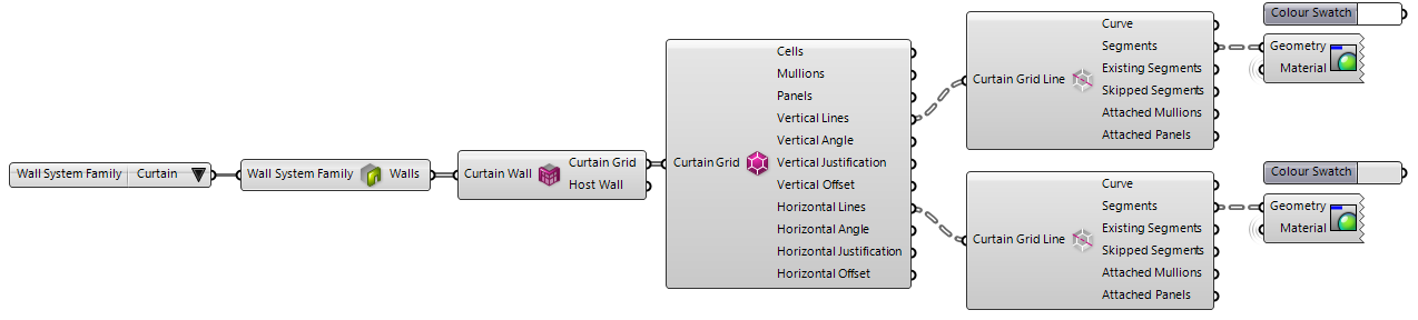 The Mullion location curve can also be extracted by passing the Mullion to a Curve component. Note that some of the mullions might have a length of zero and are not visible as geometries on the curtain walls: