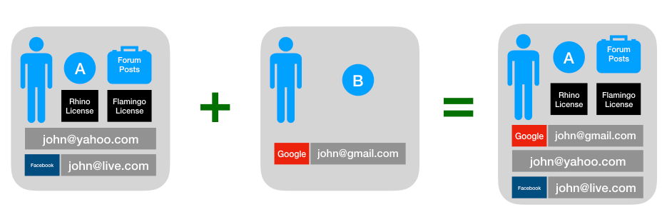 - Associate any email addresses and add any linked accounts that were previously associated with account B.
