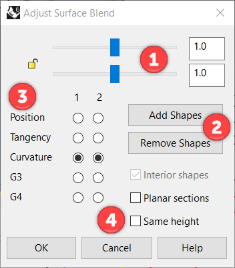 Adjust the settings in the dialog box to the default value of 1.0, and click OK to make the blend surface.