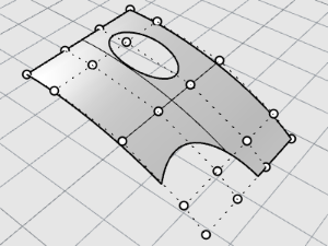 If you create a surface from a planar curve, it can be a trimmed surface. The illustrated surface was created from a circle. The control points display shows the rectangular structure of the surface.