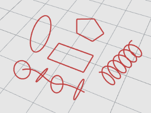 Rhino provides many tools for drawing curves. You can draw straight lines, polylines that consist of connected line segments, arcs, circles, polygons, ellipses, helices, and spirals.