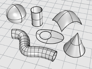 The fundamental geometric objects in Rhino are points, curves, surfaces, polysurfaces, solids, light-weight extrusion objects, and polygon mesh objects.