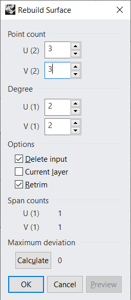 command. - In the Rebuild Surface dialog box, make sure the options are as follows, and press :